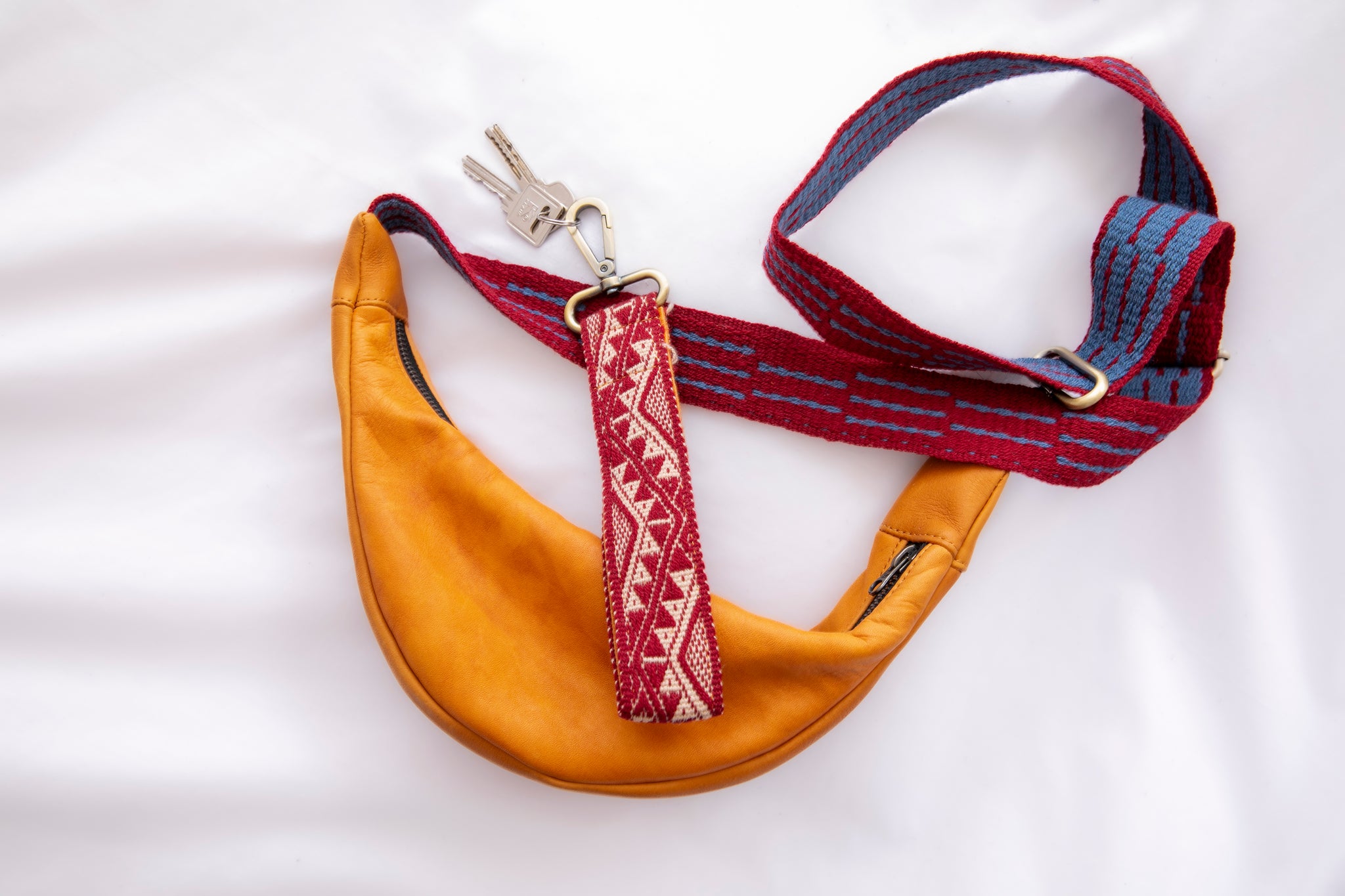 In rural Peru, backstrap weaving is a practiced, traditional process that has been passed down for generations. Textiles woven using this technique are only as wide as the weaver’s hips, and the weaver uses the tension of her body to control the tension in the loom and textile. The backstrap loom is portable, and requires only two stakes to set up. Weavers often roll the stakes up with the loom and carry it around with them, weaving whenever it is convenient.